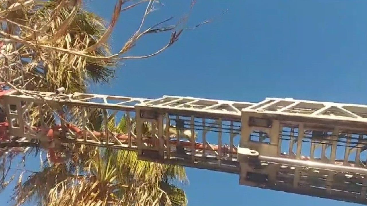 Mersin'in Silifke ilçesinde günlerdir bir palmiye ağacının tepesinde mahsur kalan sokak kedisi, duyarlı vatandaşların ihbarı üzerine itfaiye ekiplerince kurtarıldı. Kedinin, uzatılan merdivenden korkmadan ve sakin bir şekilde aşağı inmesi yüzlerde tebessüm oluşturdu.